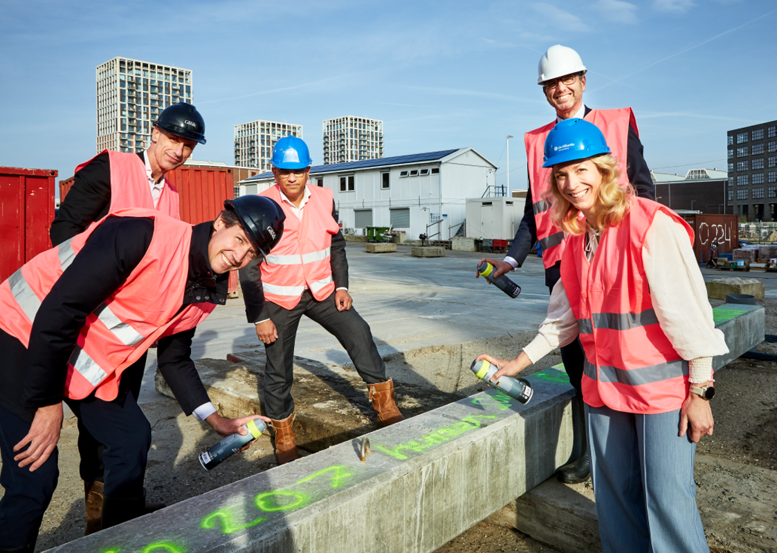 De bouw van BuurtHaven op de NDSM-werf in Amsterdam is officieel gestart. Met dit moment zetten wij, samen met onze partners, een belangrijke stap in de ontwikkeling van een toekomstbestendige en inclusieve woonomgeving in Amsterdam-Noord. De start van de bouw werd feestelijk gemarkeerd door onder anderen onze directeur Eva Hekkenberg en de wethouder, die een persoonlijke graffiti boodschap achterlieten op een heipaal.