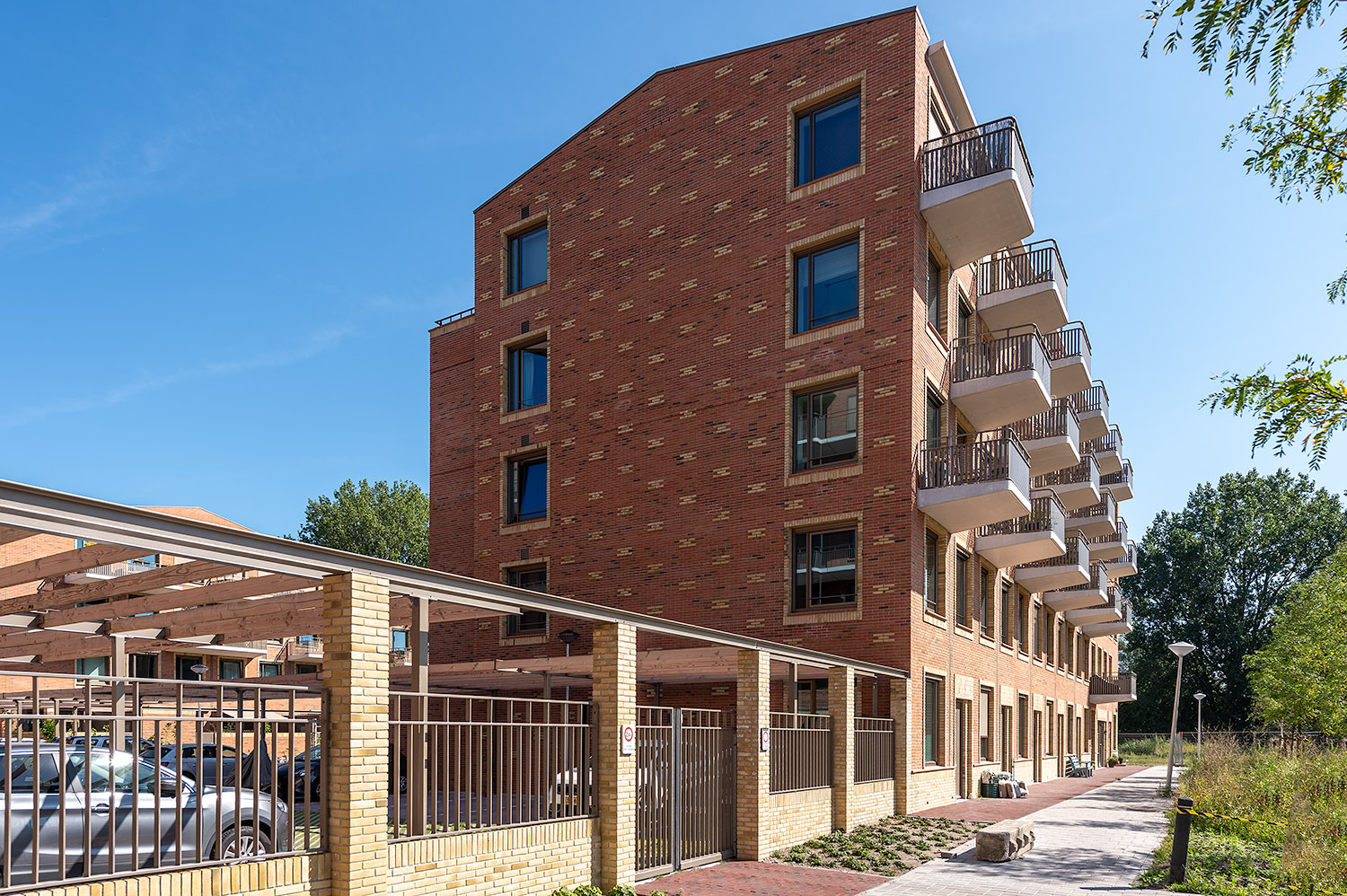 Elementen uit de oudbouw komen terug in het nieuwe ontwerp, zoals metselwerk en flauwe kappen. In de oudbouw bestond de begane grond uit bergingen. In de nieuwbouw komen daar grondgebonden eengezinswoningen, waardoor de buurt een levendiger karakter krijgt.